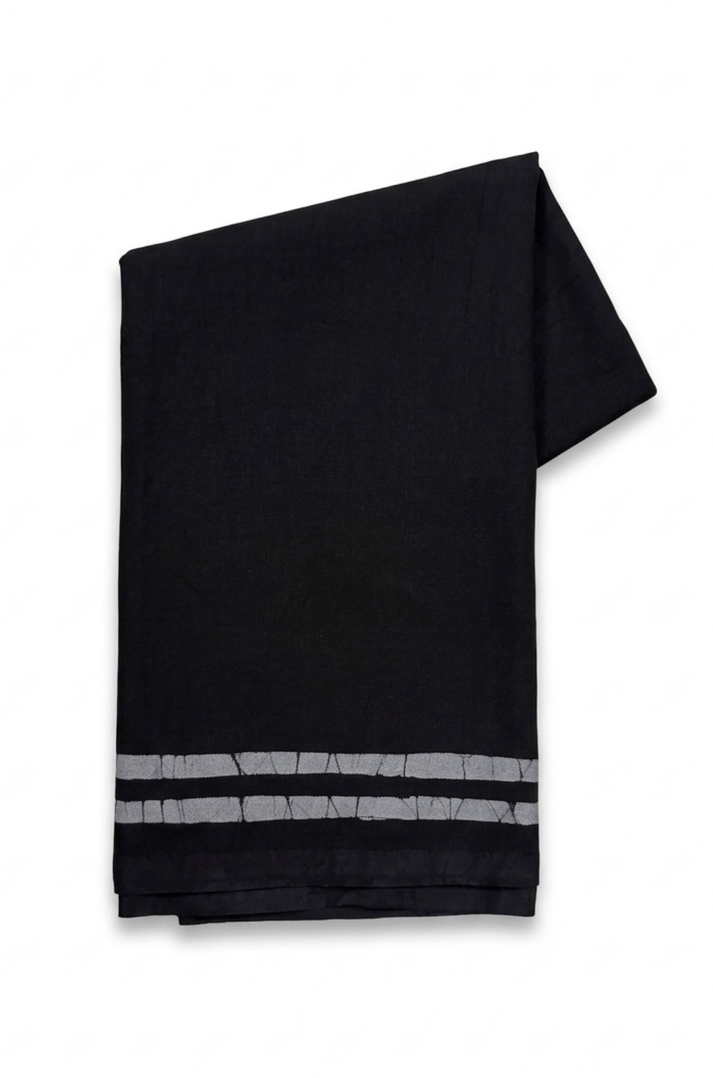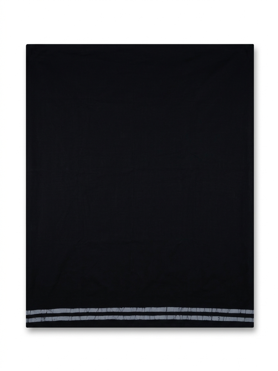 Expertly handcrafted from 100% Premium Cotton, this fabric offers a superior hand-feel, ensuring maximum breathability and durability. The deep, midnight black base is accented by two signature hand-batiked grey parallel lines, creating a sharp, professional contrast that stands out in its simplicity.